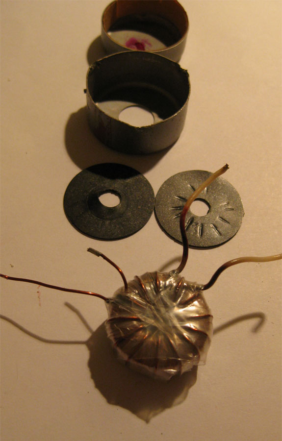От верхнего изолированного зажима капсюля идет экранированный проводок, у которого подпаян к зажиму только центральный провод, экран изолирован. Этот провод идет к концу первичной обмотки (толстый эмаль-провод), начало первичной подпаяно на корпус мет. чехла, к нему же подпаян экран сигнального проводка ленточки. Начало вторичной (повышающей, тонкий эмаль-провод) подпаяно на корпус мет. чехла, конец уходит на внутреннюю схему. Таким образом мет. чехол - это минус, жила экранированного проводка - вход (от ленточки) и последний проводок - выход.
