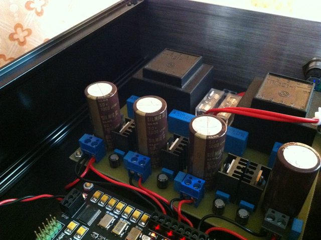 Сразу скажу, что плату ЦАПа сам не паял, опыта работы с смд очень мало, особенно для такого ответственного дела. Мною был изготовлен только блок питания и выполнены монтажные работы. Хитростей нет: 4 раздельных питания, включая +/-5 вольт для ОУ на выходе, диоды Шотки, электролиты Elna Silmic II и r2a, фильтр ЭМП на входе.