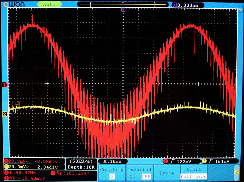 Желтый - первого порядка, пассивный RC 10K+10n , на него действительно помехи действуют.