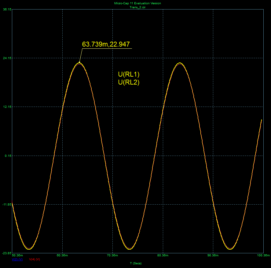 2) Средняя картинка - напряжения на сопротивлениях нагрузки RL1 и RL2, очень близки по величине;
