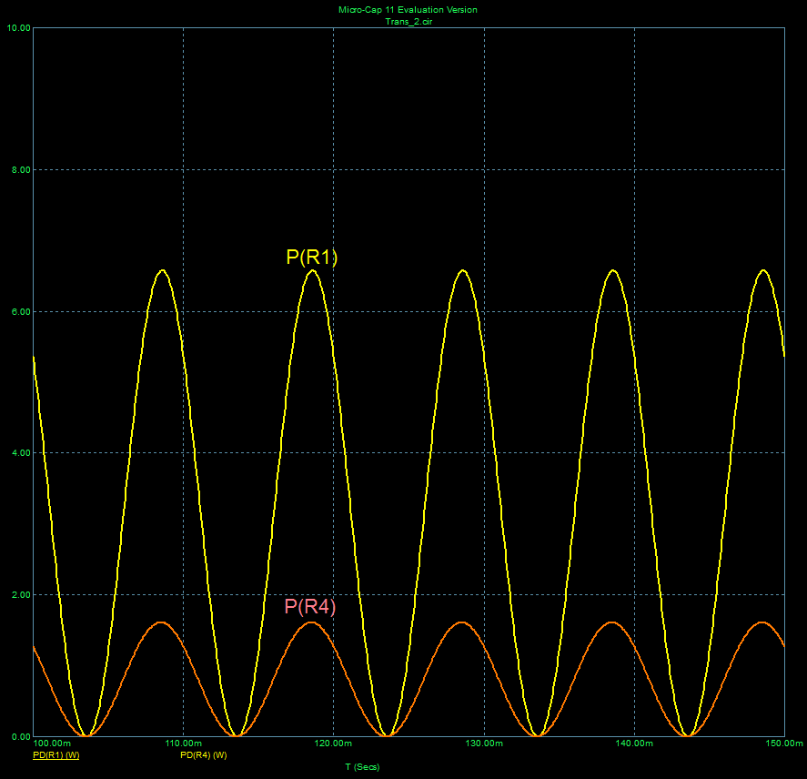 мощность, выделяемая на активном сопротивлении обмоток трансформаторов K1 и K3. Видно, что в схеме со "сдвоенными" трансами мощность, выделяемая на первичных обмотках трансов, примерно