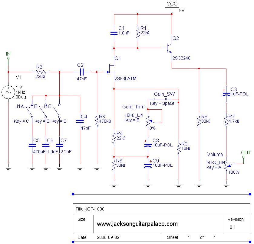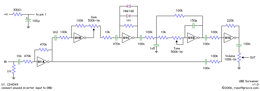 Схема старая с Раноффгрув, но обращает на себя внимание тот факт, что сигнал со входного буфера U1A подается не только на дальнейшее искажение, но и попадает на выходной смеситель "чистого" и "грязного" сигналов U1E.