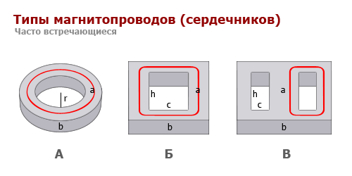 Красным цветом обозначена длина средней линии магнитопровода. Она считается следующим образом, для типов: