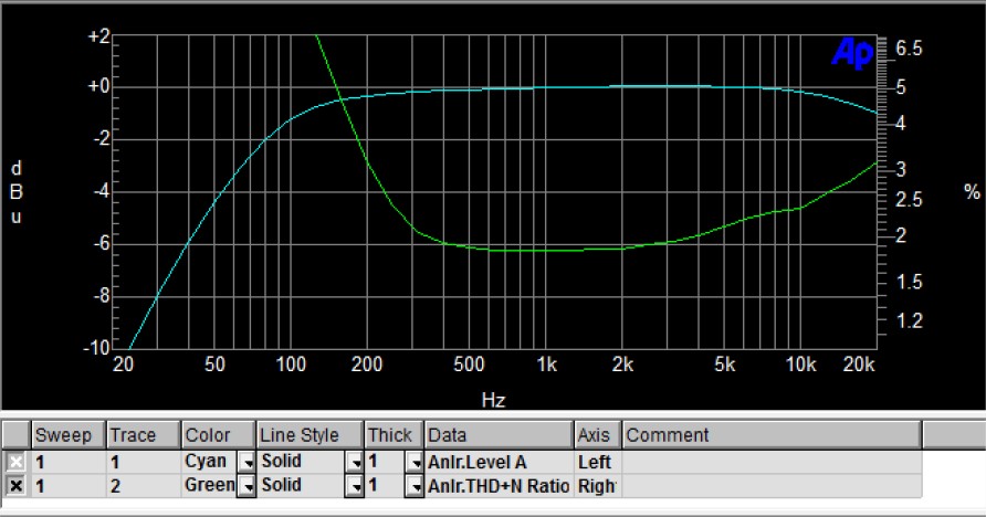 - зелёная линия - суммарный коэффициент нелинейных искажений %, шкала справа