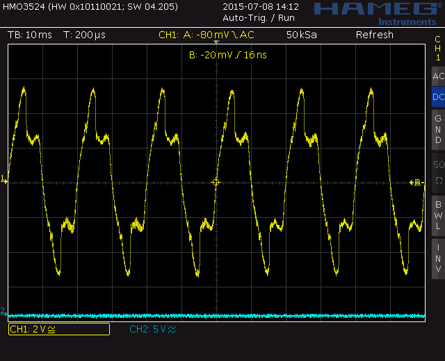"Это какая частота, амплитуда напряжения и тока? "  -  " Посмотрев форму тока, можно увидеть, насколько он кривой, " - вот я и посмотрел ток через обмотку, включенную в сеть 220 В, 50 Гц