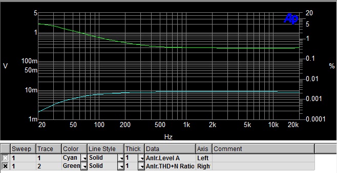 А теперь посмотрим - что происходит с АЧХ на нижнем краю при изменении уровня выхода. Всё снято на тест-машине Audio Precision. На картинках голубая линия - АЧХ, реальный уровень выхода - в названии файла. Зелёная линия - THD %, в данном случае не суть, но косвенно можно оценить некоторые вещи. Снято на уровнях выходного сигнала 1, 5, 10 и 20 вольт. Разделительные конденсаторы на сетки ламп - 0.22 мФ.