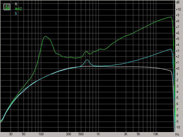 Оформление 4х12, как самое предпочтительное с "гитарной" точки зрения, да и все остальные тоже, не согласовано "по фэн-шую" с параметрами ГД. Очевидно, вследствие наличия самого оформления "вылазит" резонансная частота собственного резонанса, но, естесственно, сдвинутая с 75ти до ~120ти Гц, а амплитуда резонанаса торчит на ~10 дБ относительно среднего уровня.