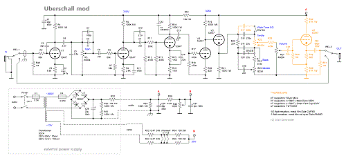 Пред убера, межкаскадка между 1 и 2-м каскадом, перепаивать даже ничего не надо, только доп. резистор бросить с центрального вывода гейна один раз на землю, один раз на анодку.