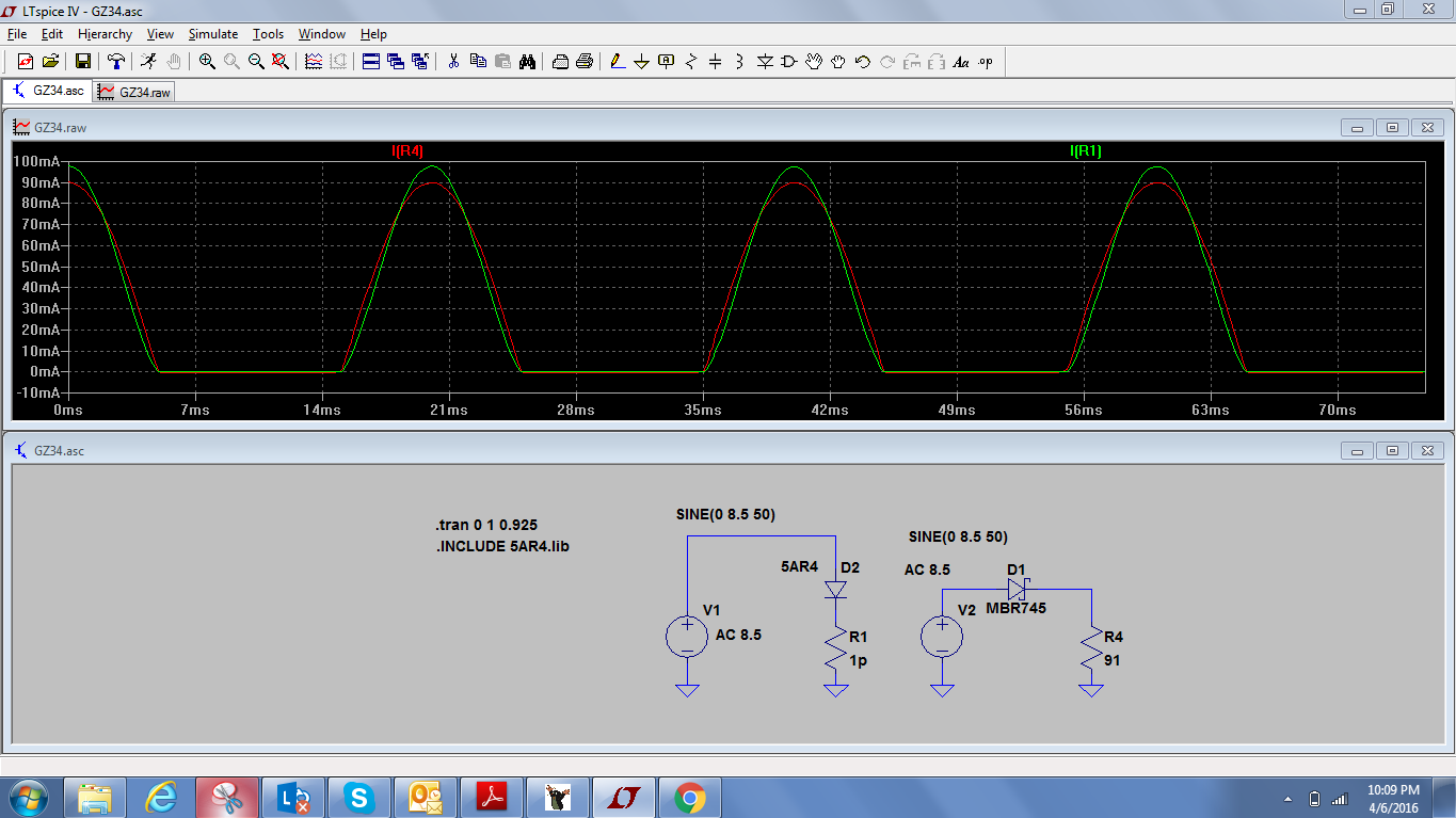 Что касается просадки на кенотроне и его внутреннего сопротивления, симулировал сегодня GZ34 (5AR4). При токах до 100ма (каждого анода) нелинейность пренебрежимо мала, это видно на ВАХ не вооружонным взглядом. ВАХ соответствует старому датащиту Amperex. Внутреннее сопротивление каждого "плеча" соответствует сопротивлению 82ом.