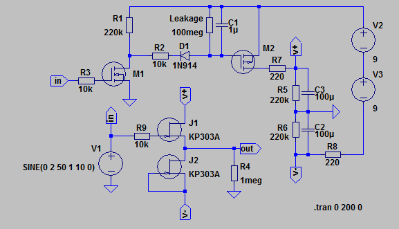 По времязадающей цепи. Утечка кремниевого диода в районе десятков наноампер, т.е. можно не учитывать. С утечкой кондеров сложнее. Керамические ЧИП обещают постоянную времени не менее 100 с, танталовые в районе 70с. В общем, надо пробовать. Время релаксации по прикидкам 200, а то и 300мс должно быть, т.е. вполне достаточное. Время включения определяется рц цепью зарядки кондера и при данных номиналах составляет порядка 3мс, т.е. в принципе не заметное для гитариста.