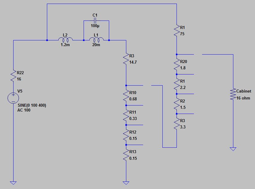 Ниже схемы и результат симуляции. На высокоомные делитель не обращать внимания. Это для накладывания кривых одну на другую. АЧХ сняты в точке соединения выхода аттенюатора с кабинетом.