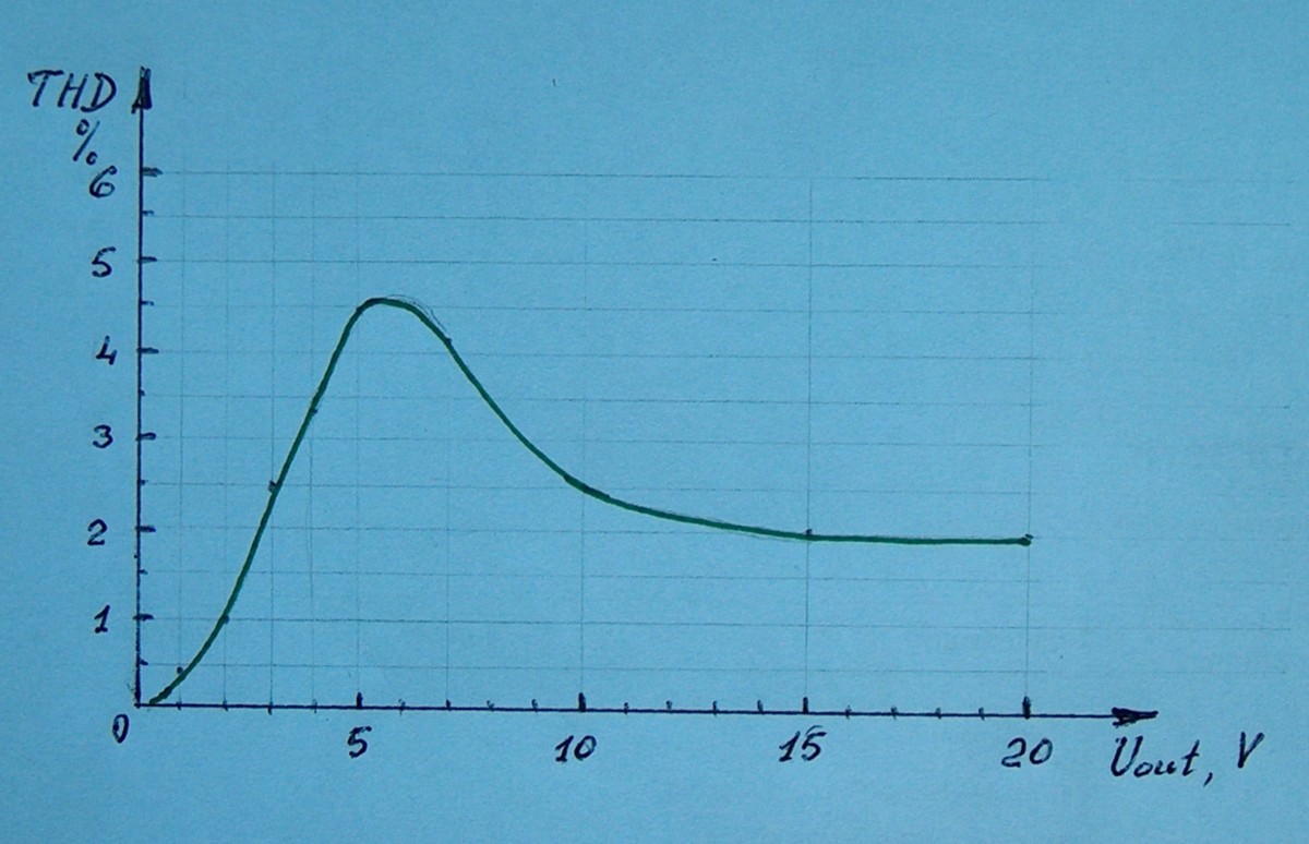 Кому влом анализировать картинки -  график зависимости THD выходного каскада от уровня выходного напряжения на эквиваленте нагрузки 8 ом. Искажения усреднены исходя из соображений, что выше 10 кГц и ниже 100 Гц они в гитарном усилителе не играют особой роли.