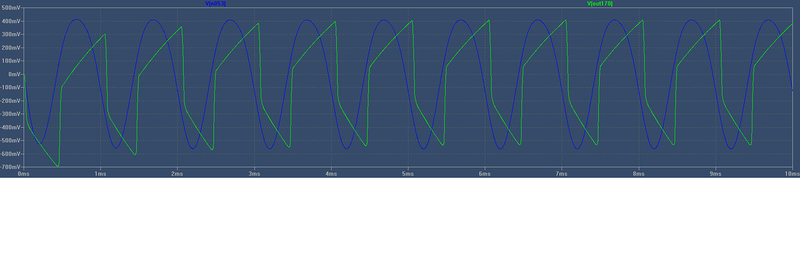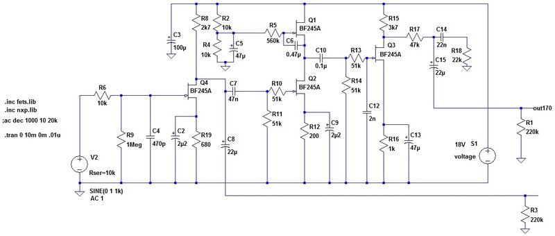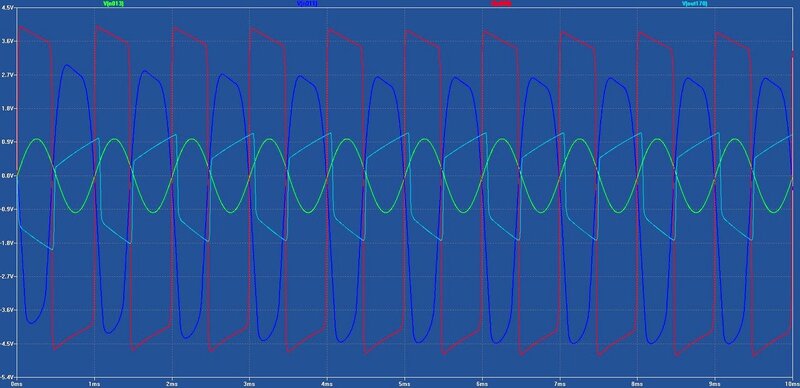 Очеловечить его удалось частично - дополнительной коррекцией на хвосте схемы, но главная причина осталась неустранённой. Я имею в виду последний каскад. Не знаю, какова роль катодного повторителя в традиционной лампочной схеме (я до сих пор считал, что уж никак не для дополнительных искажений!), но в БСИАБе истоковый повторитель крушит сигнал по-страшному. Видимо, сигнал rail-to-rail на затворе для него, мягко говоря, чрезмерен. Ибо сам он там выглядит весьма благообразно: симметричные трапеции со стёсанными углами (осц был с подобающим делителем, дабы не внести расстройства в нежное нутро схемы). Замена транзистора J201 на другие экземпляры, а также на 2N5457 эффекта не дали никакого. Плотный монтаж исключал возможность лабораторных работ и пришлось оставить, как есть.