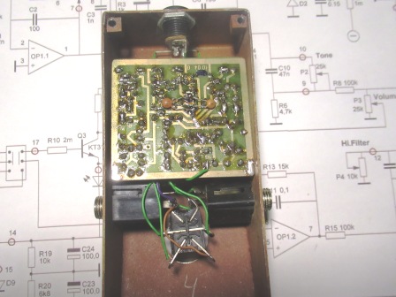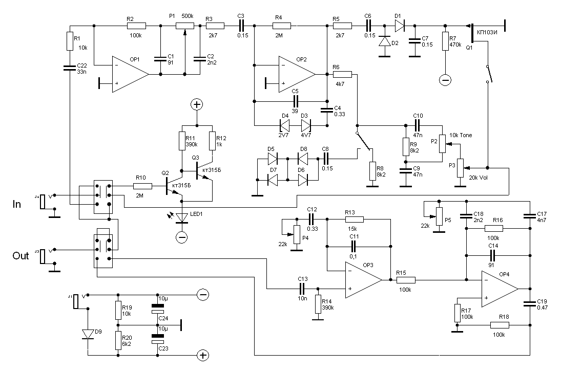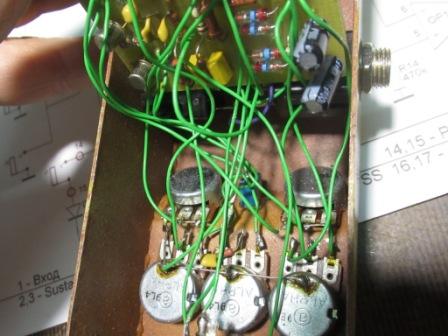 R24 (TREBLE) регулирует частоту среза каскада по ВЧ для фильтрации  “песка”.   Благодаря такой схемотехнике, удалось получить интересные, по своему красивые, тембровые звучания и с довольно низким уровнем шума.