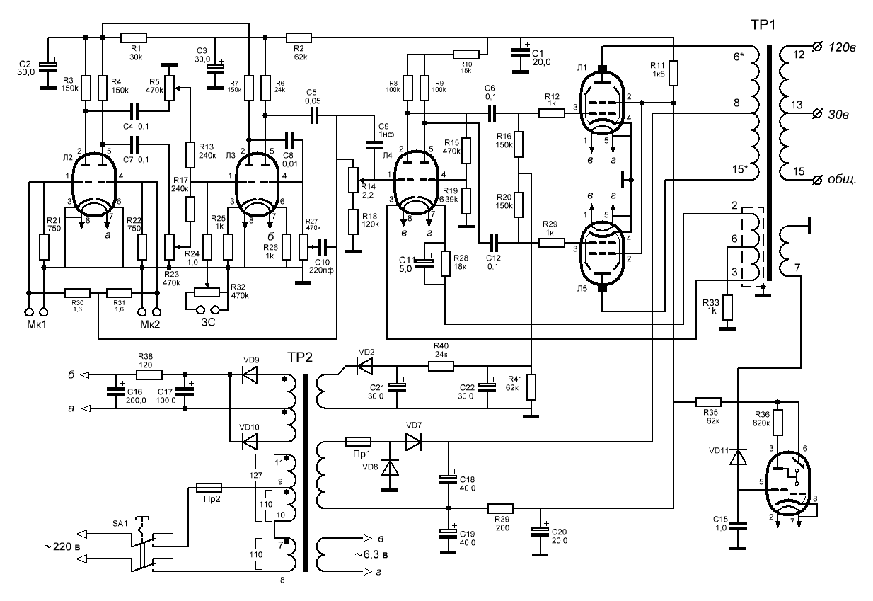 Второй каскад представляет собой традиционную схему ограничения на микросхеме, в отрицательной обратной связи которой, включены диоды VD1-VD5 по “ламповой» схеме.