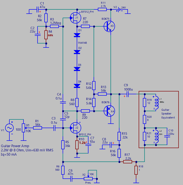 Питание +24 Вольта (выходной каскад), входной каскад питается от +18 Вольт через RC-фильтр, т.к. примененные транзисторы BF512 выдерживают не более 20 Вольт. Общий максимальный ток потребления порядка 0,5 Ампер при сильной перегрузке; замерял с резистивной нагрузкой 8,2 Ом.