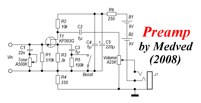 Еще раз - между точкой соединения R2, С2, которые находятся в преампе, и стоком полевика(в гитаре) и проходит гитарный кабель, по которому идет и питание, и сигнал. Регулятор громкости, правда , придется перенести на вход каскада...Зато нет батарейки, садящейся всегда не вовремя. :)