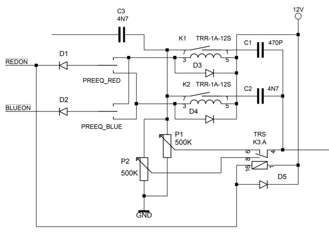Если сделать два комплекта кондеров и каждый завесить на свой движок, то представь следующую ситуацию - включен красный канал, а на синем преэквализация 4n7 и гейн выкручен в 0. Верхние концы потов получаются зашунтированы на землю через 4n7 неактивного канала. То есть положение движка неактивного канала будет влиять на ачх активного. Вот этого они и постарались избежать.