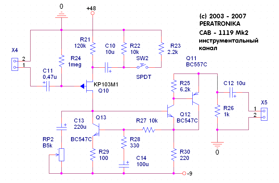 Поскольку в основном (микрофонном) канале удалось добиться неплохого результата по спектру искажений, то мне захотелось выпендриться и в гитарном канале тоже - обеспечить на выходе только искажения полевика: