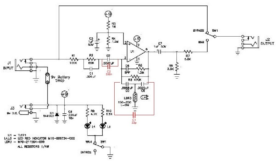 Доработка педали напрашивается сама: конечно же надо кнопку включения установить под платформу педали и конечно же - светодиод впереди . Кстати, производитель решил, что подключив светодиод через 6.8ком на 9V мы получим достаточную яркость. R10 уменьшить до 1ком. Если планируется работать от "Кроны", тогда лучше заменить на сверхъяркий.