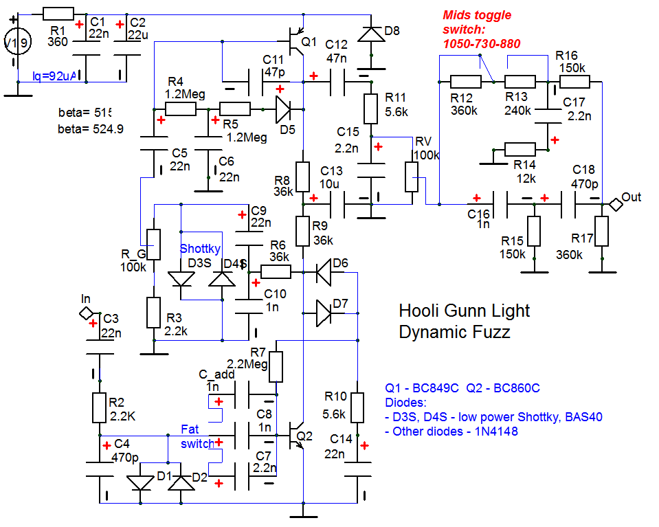 Должен сказать, что, несмотря на полученные совпадающие результаты, тем не менее, следует согласиться с замечанием коллеги Peratron'а: конденсатор С6 надо не землить, а сажать на эмиттер верхнего триода, и это должно быть обычным правилом в ситуациях подобного рода.
